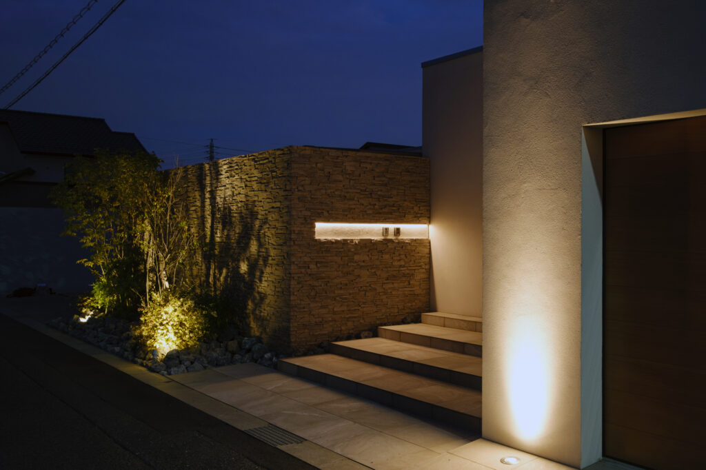 外構で差をつけるには、ポイントになるのは「素材の使い方」と「ライティング」です。
