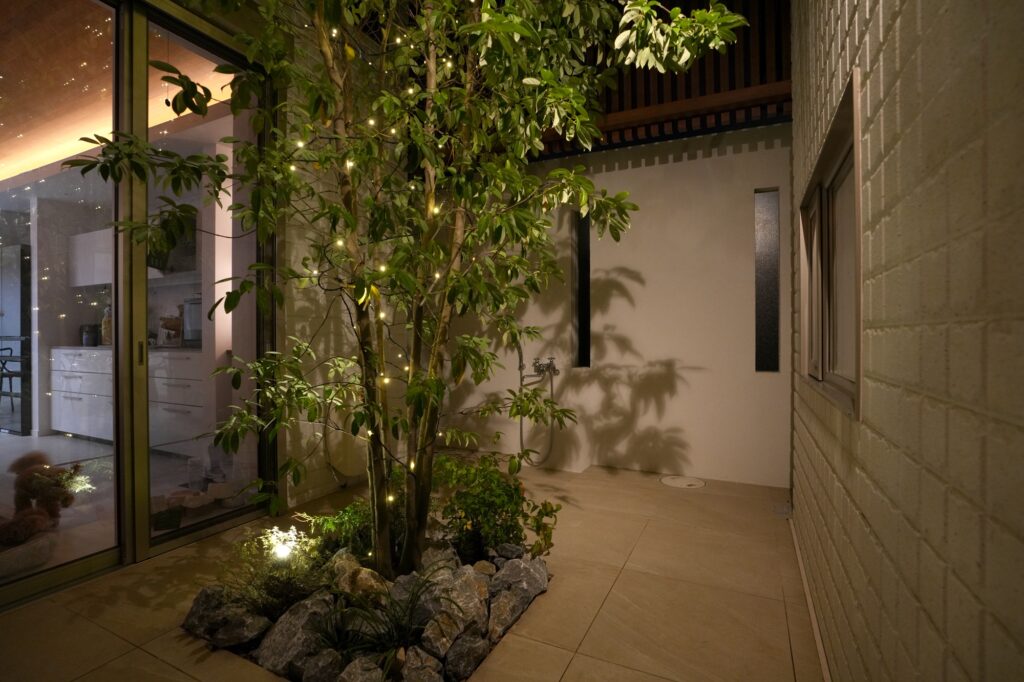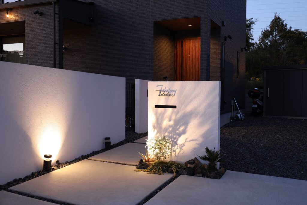 門まわりやアプローチ、植栽を照らすことで陰影が生まれ、昼間とは違った雰囲気を演出できます。