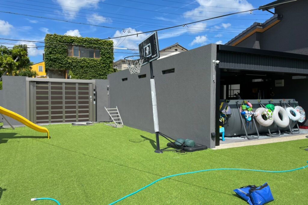 車庫と門を一体化させることで、外構全体に統一感が生まれます。