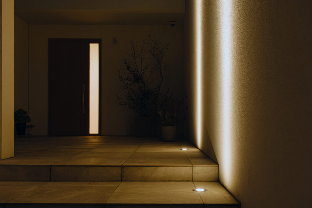 たとえば、アプローチにラインライトを入れると、夜間も安全に歩けます。