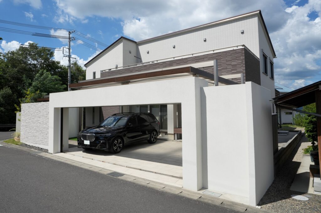 カーポートはフラットな屋根のタイプを選定し、スタイリッシュな印象に。