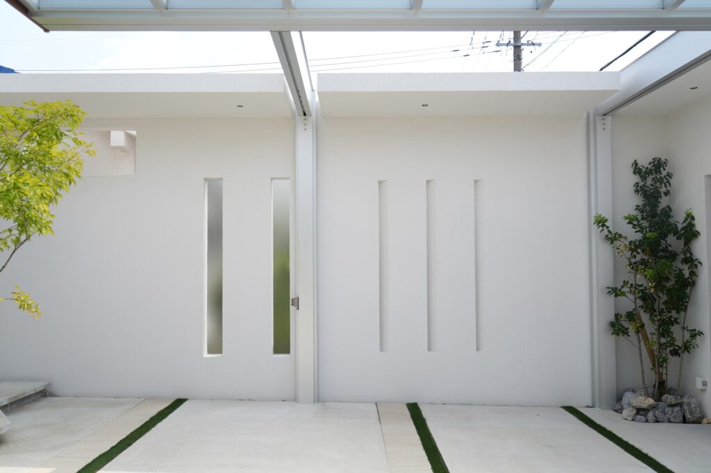 続いては、白い外壁が美しい邸宅に合わせたリゾートテイストのセミクローズ外構です。