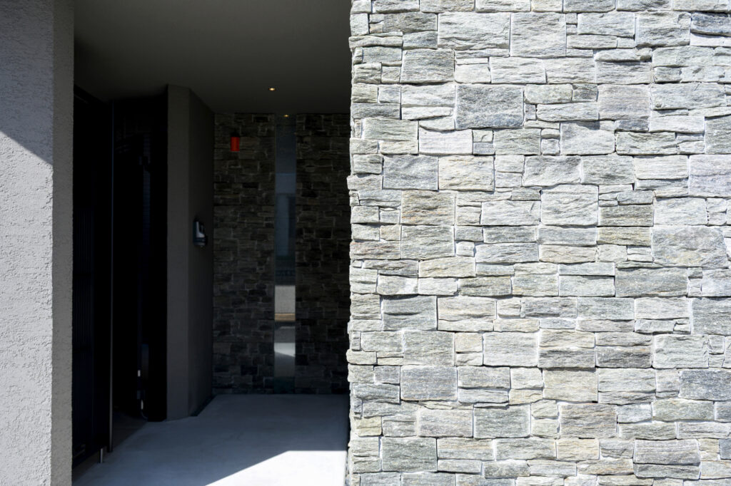 門柱には天然石を貼り、表札とインターホンをビルトインで収納。