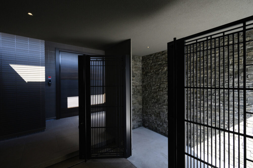 シャッターゲートは電動式を採用し、門扉から駐車スペースまで一体感のある設計に。