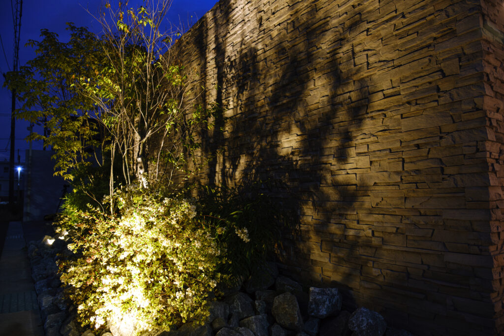 間接照明やアップライトを使って植栽や壁面を照らすと、立体感が生まれ、幻想的な雰囲気に仕上がります。