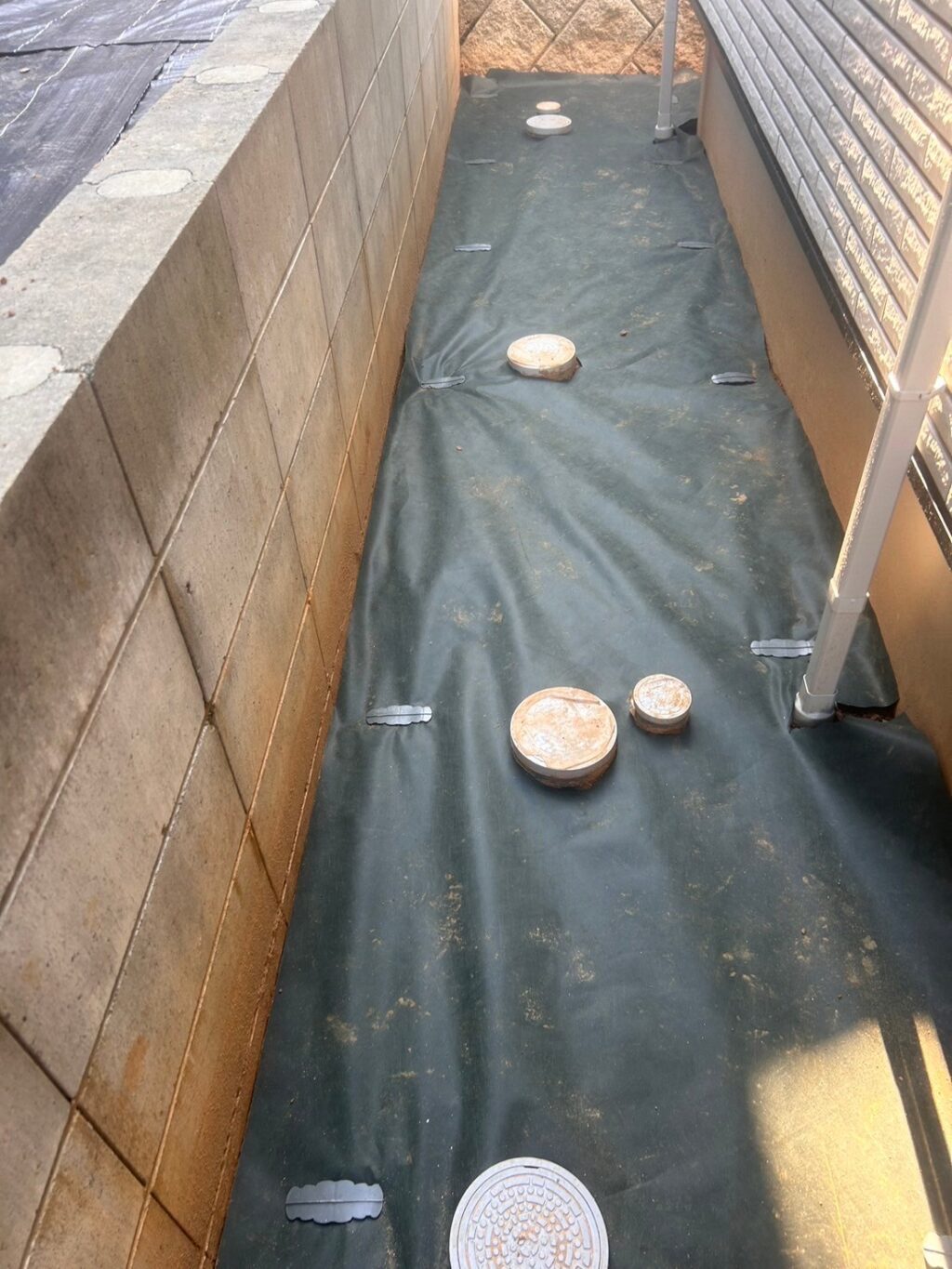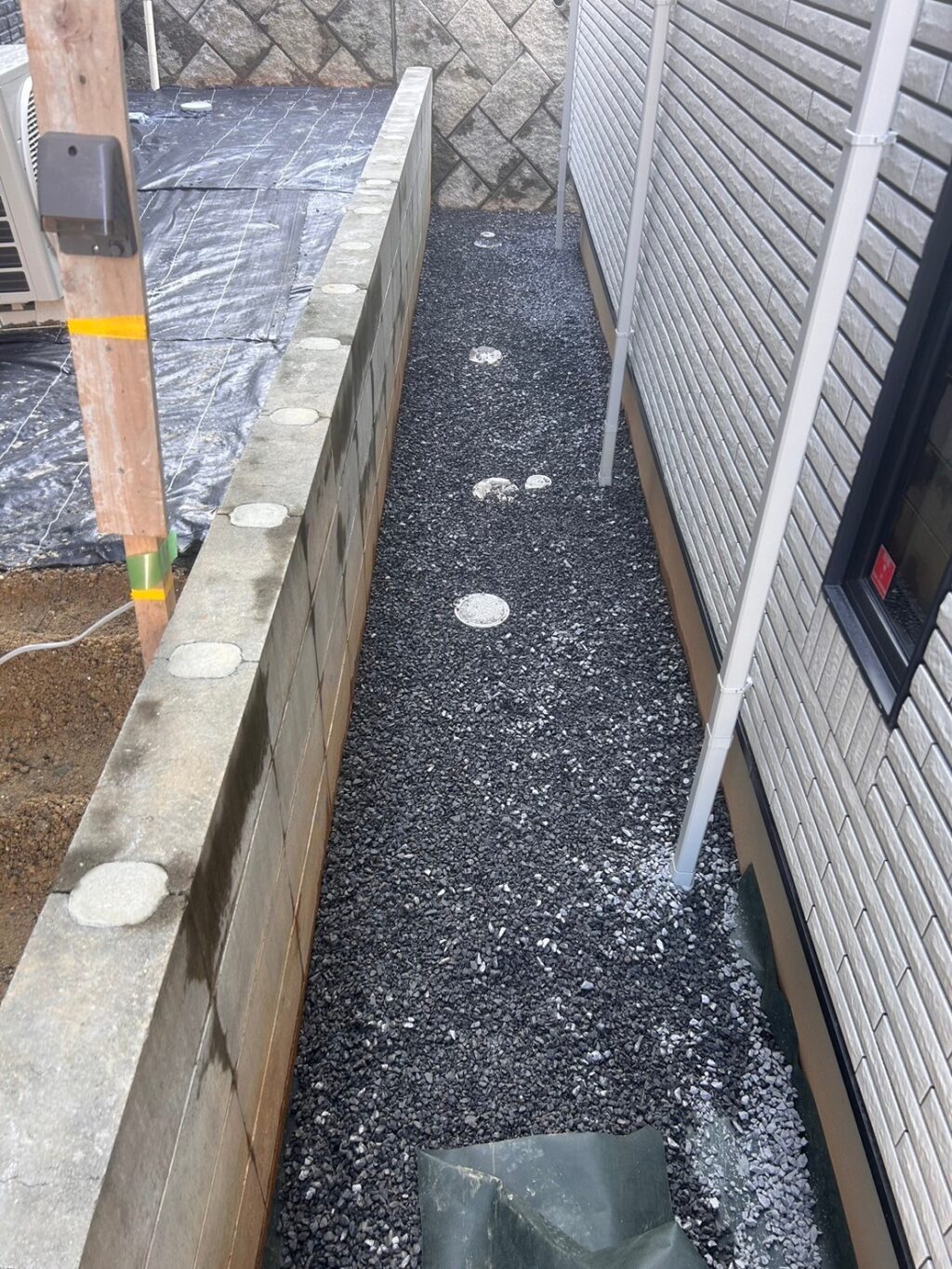 お家回りは、草が生えないようにと防草シートを敷き、その上からさらに砂利を敷きます。