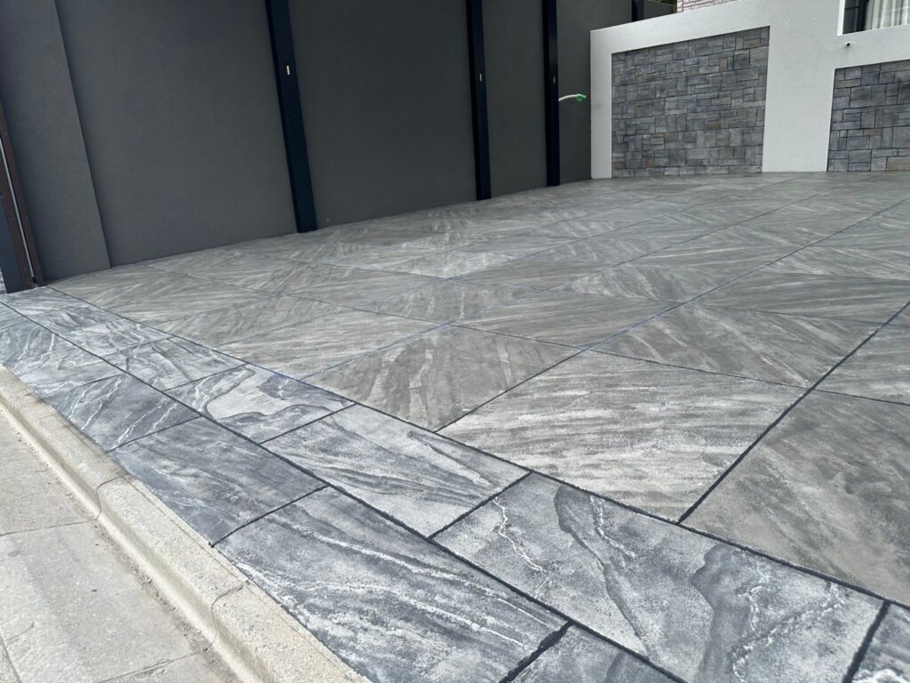 グレートーンの石調模様の重厚感が全体の高級感を引き立たせ、白色がその魅力をさらに際立たせています。