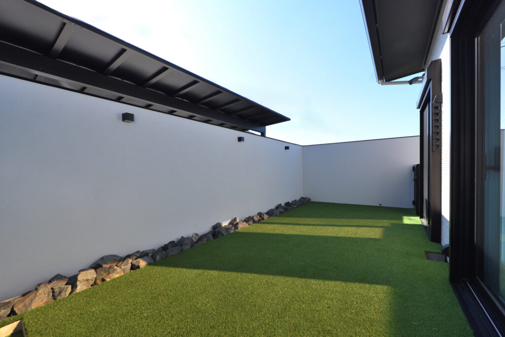 通常タイルデッキが選ばれることが多いテラス部分ですが、S様は愛犬が季節を問わず走り回れるよう、人工芝を採用。