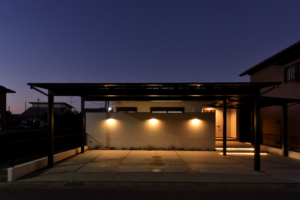 S様のご要望で、「玄関から駐車場まで雨に当たらない導線」を実現するため、2種類のカーポートを連結。