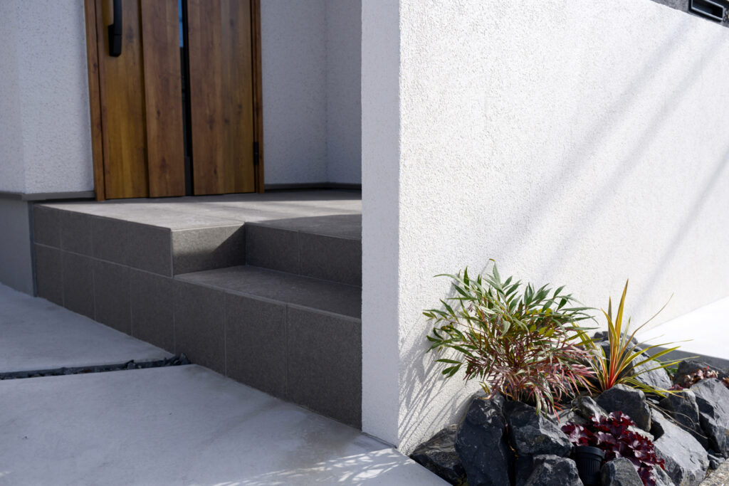 この外構デザインの大きなポイントのひとつが、ダイナミックな大階段と高さを変えた角柱の配置です。これにより、エントランス部分に立体感が生まれ、平屋でありながらも印象的なデザインとなりました。