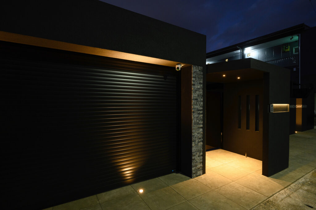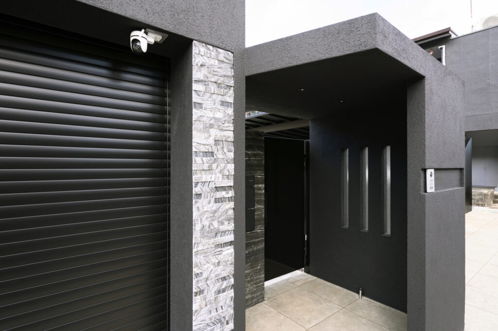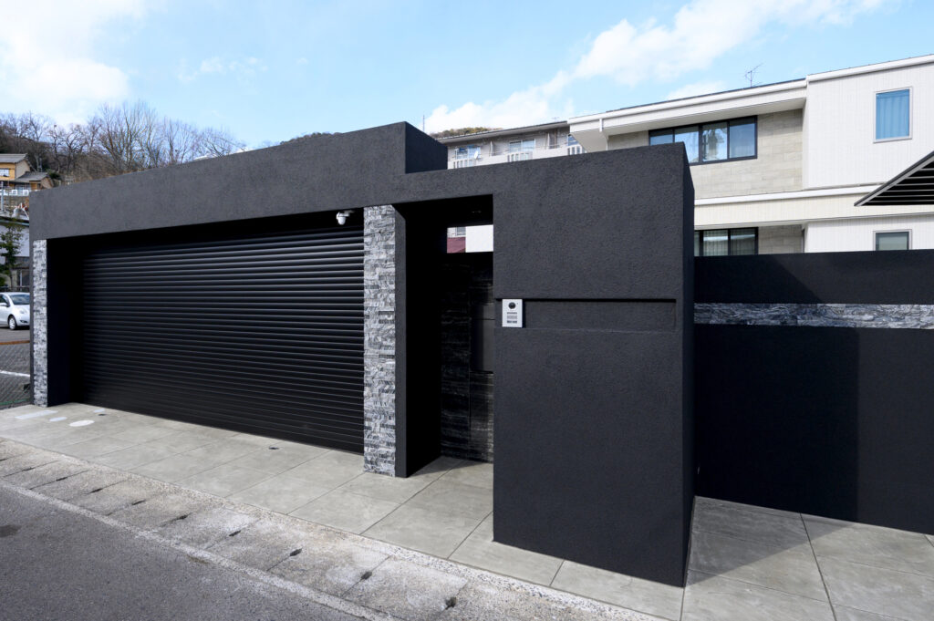 施主様の「ブラックカラーが好き」というご要望を丁寧に反映し、外周の目隠しからエントランス、シャッターゲートに至るまで、すべてに統一感を持たせた外構デザインを実現しました。