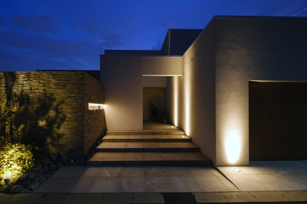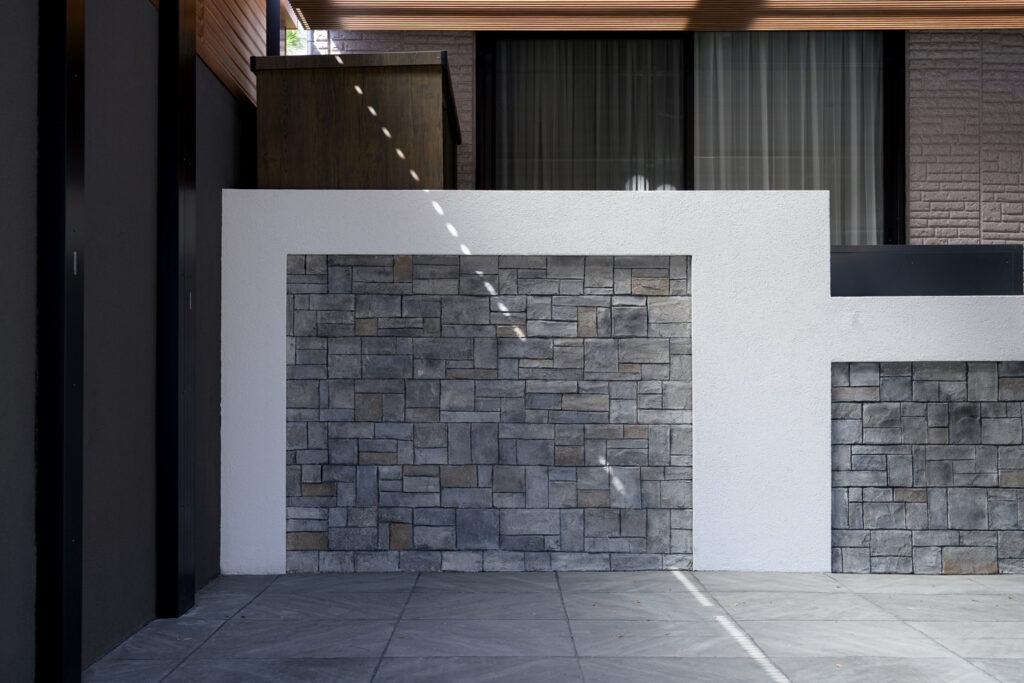 アプローチには石貼りを取り入れ、機能性だけでなくデザイン性も両立しています。