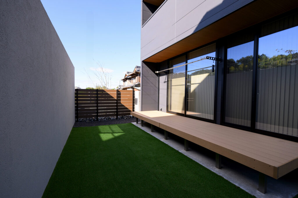 リビングからつながるウッドデッキに加え、庭には人工芝を敷設。