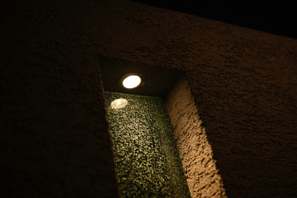 照らされた壁の凹凸が際立ち、日中とはまったく異なる表情を楽しめる空間に仕上がりました。